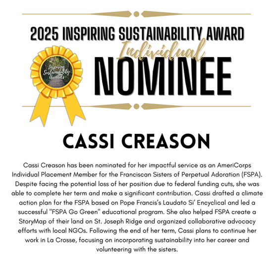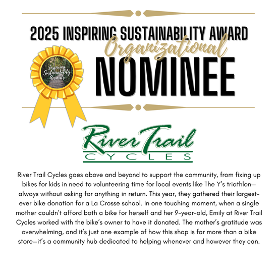 This year, thanks to your nominations, we have 16 outstanding nominees. Our Executive Board will now review these nominations and select one individual and one organizational winner. The winners will be announced live at our awards event on October 28th from 6-8 PMÂ at the La Crosse Distilling Co., a past Inspiring Sustainability Award winner.